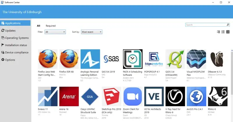 Using the Software Center The Software Center shows all the University applications available to install on your PC.Some of these are available for installation immediately; others have license restrictions which need to be checked before they can be installed.It can be accessed by clicking Start and searching for "Software Center". Approval for Apps Many apps are available for immediate install and do not need approval. Clicking the ”Install” button will begin the installation process.For ones needing approval, click the ”Request” button to contact the license manager.Before raising a request to install the software please check your entitlement to use the software with your computing support team.The appropriate colleague will get back to you approving or denying the request. If approved, the 'Request' button will turn to 'Install'. This article was published on 2024-10-08