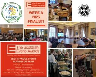 The Events Management Community has been shortlisted for the Best In-House Events Planner or Team at the Scottish Event Awards on 24th April! The Events Management Community (EMC) is an exciting and vibrant group of colleagues from across the University who voluntarily collaborate together to share advice and best practice, and help with anything events management related. Initiated in Summer 2022 by Dawn Dodd and Catherine Hetherington, the January 2024 relaunch event and word of mouth saw membership soar from 255 to over 450.Nominated by the EMC committee, the community has been shortlisted for the Best In-House Events Planner or Team at the Scottish Event Awards, ‘where the industry’s best and brightest come together’! This recognition highlights the dedication, creativity, and expertise of everyone involved in planning and delivering events at the University and showcases their commitment to creating memorable experiences for our staff, students, clients and partners. Dawn Dodd and Catherine Hetherington Founders of the Community The award criteria, 'recognises individuals or teams who organise events for their own organisation or its clients. Judges will evaluate how the team considers the design of events, the diversity and creativity of the event formates, how the group addresses and overcomes challenges throughout the planning and delivery process, and any feedback that highlights the team's success in running events effectively.'From welcoming new members by induction talks to sustainability conferences discussing the future of environmentally-friendly events, the feedback from members is always positive who look forward to the next event. The dedicated Teams channel is a haven for event planners, bringing a decentralised community together to ask questions, update on different events, and share news. It’s safe to say the EMC is a very strong contender to win! Fabulous get-together yesterday, everyone! I’m so looking forward to the next chapter in the EMC and meeting even more of our tribe from across the University. Thanks to the committee and ACE for event planning for a room full of event pros! Helene Frossling Mattsson Events Manager, School of Social and Political Science If you would like to know more about or join the EMC, please contact Dawn Dodd (dawn.dodd@ed.ac.uk) or Catherine Hetherington (catherine.hetherington@ed.ac.uk). Publication date 31 Mar, 2025